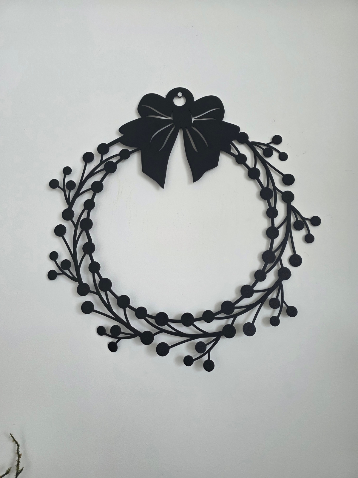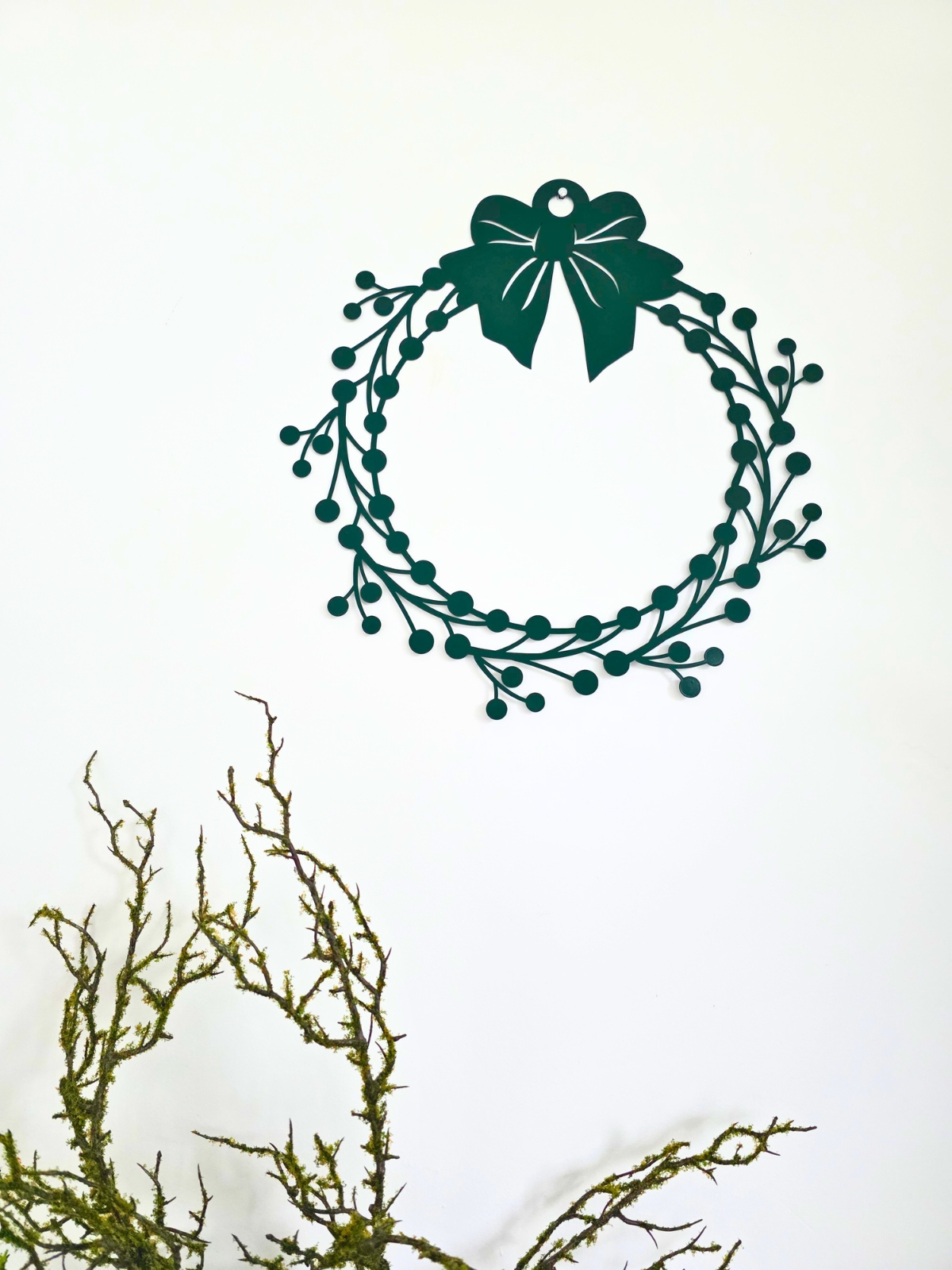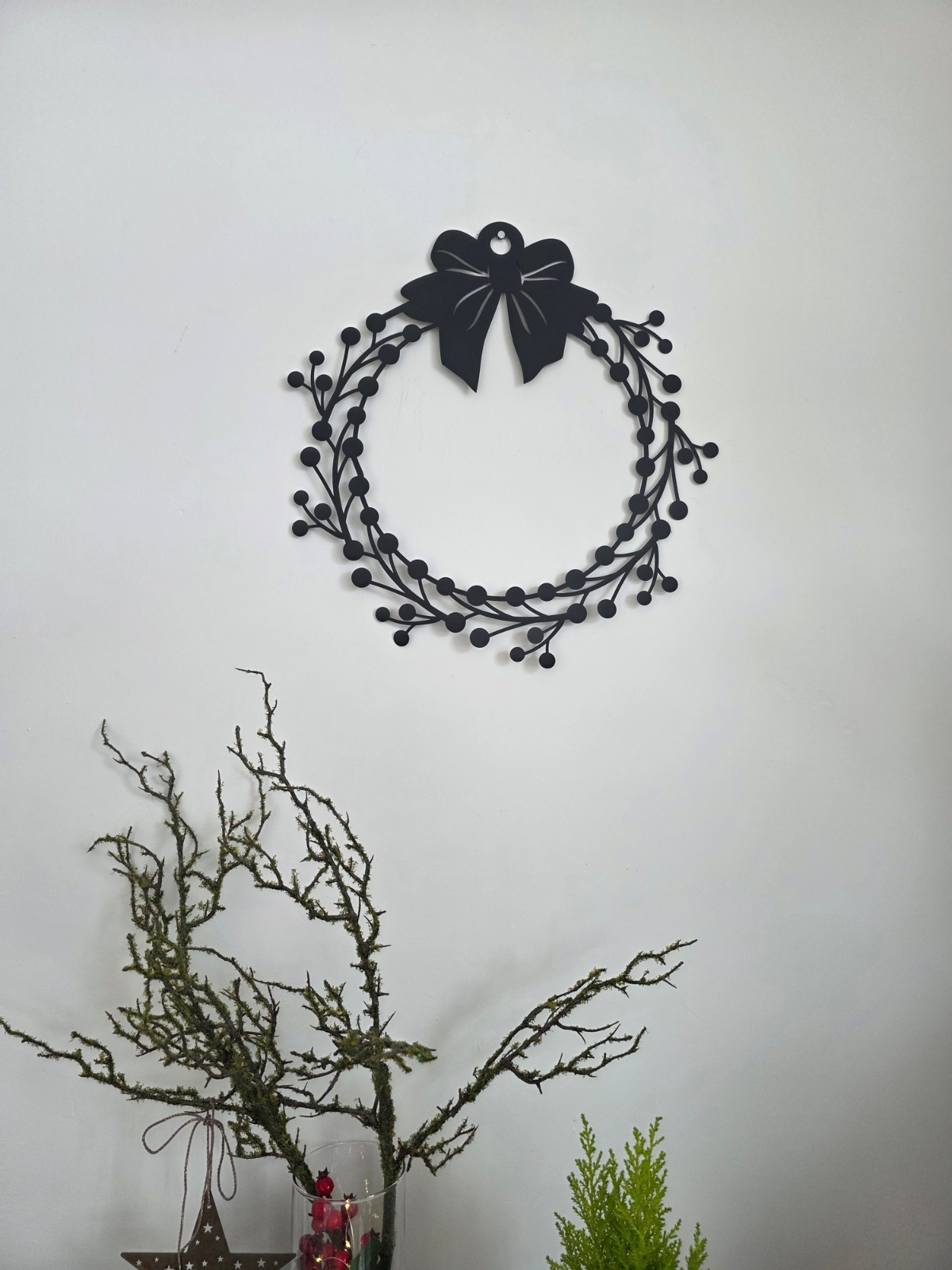 Wprowadź elegancki, świąteczny akcent do swojego domu dzięki metalowemu wiankowi na drzwi. Ta dekoracja łączy minimalistyczny design z precyzyjnym laserowym wycinaniem, co sprawia, że wianek wyróżnia się subtelnością i nowoczesnym charakterem. Idealnie sprawdzi się zarówno na drzwiach wejściowych, tarasowych, jak i w pomieszczeniach, wprowadzając wyjątkową atmosferę Bożego Narodzenia.